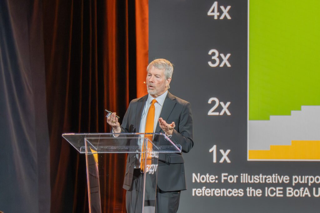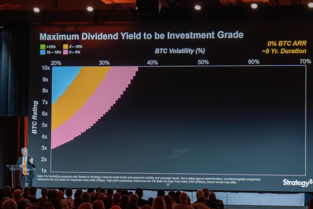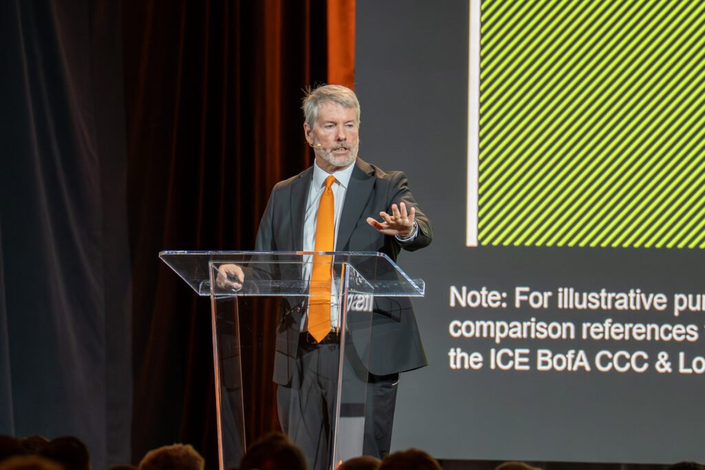 During the keynote, Saylor emphasized that digital credit represents a “refinement of digital capital,” combining innovations like proof-of-work, public-key cryptography, and peer-to-peer networking with traditional financial tools such as preferred equity and variable dividends (STRC).